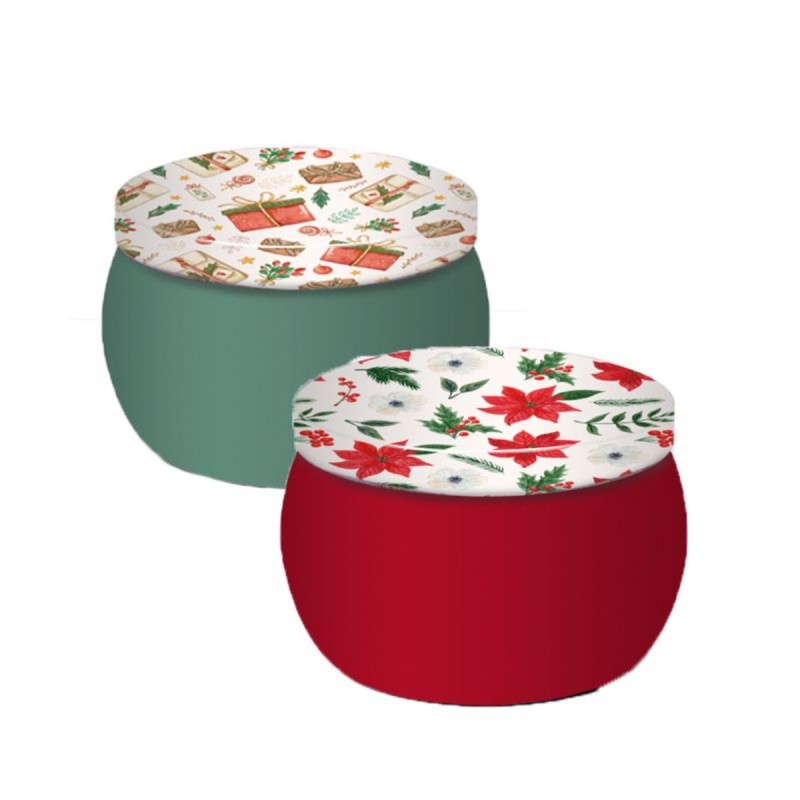 Set de x2 Caja Pequeña Decorativa Redonda de Metal Estampado Navidad, 2 Modelos Incluídos, Cajita para Dulces Navideños,